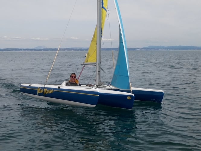 Petit trimaran permettant aux personnes à mobilité réduite et aux valides de naviguer. L'habitabilité de sa coque centrale permet d'accueillir jusqu'à deux personnes pour le